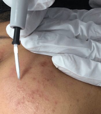 The skin is cleansed and the treatment is carried out. It takes about 10 to 15 minutes to complete. A warm pinch like sensation is felt each time. There may a tiny scab at each location. There may also be some temporary redness where the treatments was carried out. You are able to cleanse the skin later that day with a gentle cleanser, and apply makeup as normal the following day.