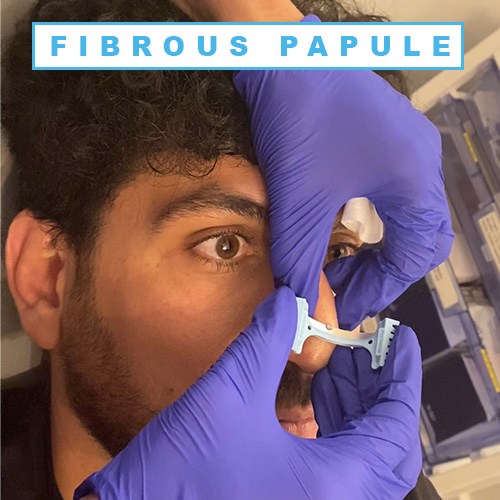 A fibrous papule is a spot on the nose that people get in early to mid adult life. A fibrous papule may measures between 1mm to 5mm in diameter.