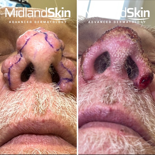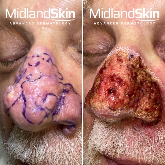 At Midland Skin, we offer advanced ablative CO2 and Erbium laser surgery to effectively treat rhinophyma, restoring a more natural nasal contour and improving overall skin texture. We can also advise on controlling early rhinophyma so as to limit its progression.